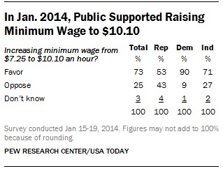 While the idea of raising the minimum wage is broadly popular, a Pew Research Center survey from January 2014 found clear partisan differences in support. Overall, 73% of people favored an increase in the federal minimum to $10.10 an hour, mirroring a Democratic-backed proposal that failed to move ahead in Congress last year. But while large majorities of Democrats (90%) and independents (71%) said they favored such an increase, Republicans were more evenly split (53% in favor and 43% opposed).